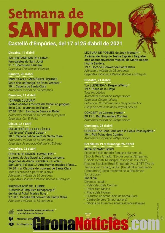 Del 17 al 25 d’abril Castelló d’Empúries celebra Sant Jordi amb un seguit d’activitats durant tota la setmana. Amb l’objectiu de portar a terme diferents actes i evitar aglomeracions, des del Departament de Festes de l’Ajuntament de Castelló d’Empúries, s’han programat un ventall d’activitats per a tots els púbics i en petit format, adaptant els espais i limitant l'aforament. Al programa hi trobareu espectacles, música i llibres amb la participació de l’Ecomuseu Farinera, la Biblioteca i entitats del poble. Enguany no hi haurà parades al carrer però no s’ha volgut perdre l’oportunitat de mantenir l’ambient festiu d’un dia tan especial.