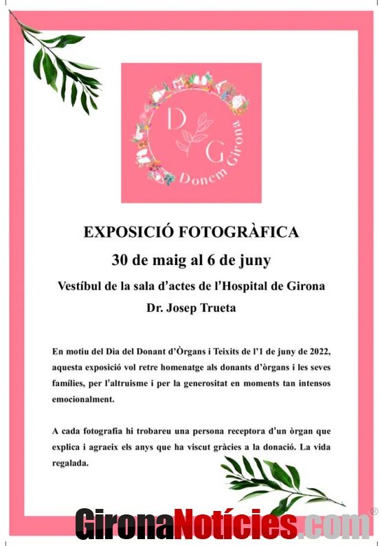 La plataforma Donem Girona, una agrupació de persones trasplantades, personal sanitari i gent sensible amb la donació de sang i òrgans, celebrarà el Dia Nacional del Donant d'Òrgans i Teixits l'1 de juny. Ho farà amb una exposició de fotografies a l'hospital Josep Trueta de Girona.