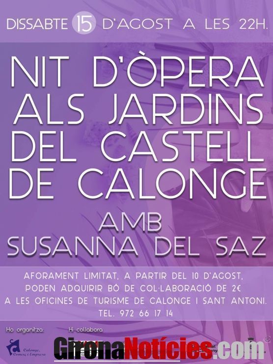 Els jardins del castell de Calonge seran l'escenari de la 1a Nit d'Òpera aquest dissabte 15 d'agost, a partir de les 22 h. És un concert organitzat per l'associació Calonge, Comerç i Empresa que, dues setmanes després de l'èxit de la Nit de Rumba, fa ara aquest esdeveniment. Hi actuarà Susanna del Saz.
