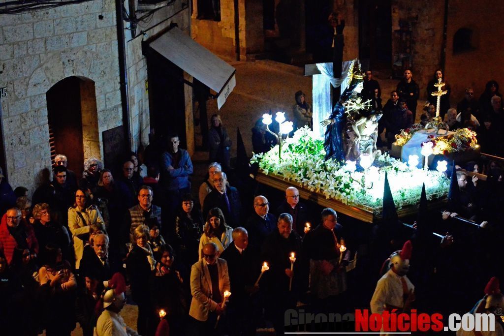 Ha estat al voltant de les nou del vespre quan ha arribat el plat fort d’aquest divendres. La Processó ha arrencat des de l’església de l’antic monestir de Sant Pere i ha resseguit amb el seu ritme profund i pausat l’itinerari habitual pels carrers, places i entorns de la localitat garrotxina.