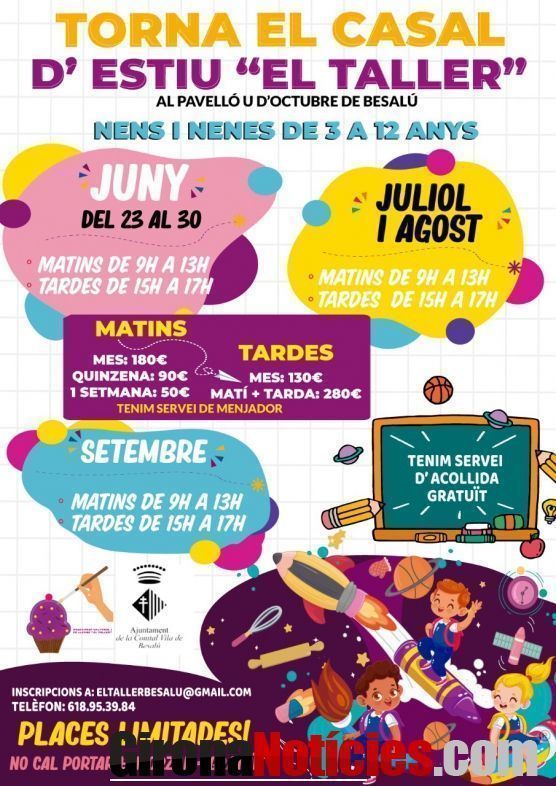 Una altra entitat que ja compta els dies per iniciar l’activitat és el Casal d’Estiu ‘El Taller’, que en aquest cas centra la seva tasca al pavelló U d’Octubre per a nens i nenes de 3 a 12 anys. L’organització contempla propostes per als mesos de juny (del 23 al 30), juliol, agost i setembre, amb diverses opcions de pagament: en el cas dels matins, la totalitat del mes tindrà un cost de 180 euros; la quinzena, 90 euros, i una setmana, 50 euros; si l’horari és de tardes, el mes costarà 130 euros; i de matins i tardes, el preu serà de 280 euros. El casal té servei de menjador (l’esmorzar, gratuït) i té servei d’acollida gratuït. Places limitades.
