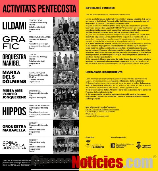 L'Ajuntament de La Jonquera ha presentat la programació especial amb motiu de la Pentecosta. Les activitats, que començaran el divendres 21 de maig i s'allargaran fins al dilluns 24 de maig, comptaran amb un estricte protocol de prevenció i seguretat per fer front a la Covid-19. Tots els espectacles tindran l'aforament limitat i serà obligatori l'ús de la mascareta i el manteniment de la distància física de seguretat. En tot moment, caldrà seguir les indicacions del personal responsable dels espais i evitar aglomeracions. Pel que fa als menors de 16 anys, les famílies hauran d'emplenar aquesta autorització perquè puguin accedir als recintes dels concerts. Així mateix, els menors de 16 anys hauran d'assistir als espectacles acompanyats d'un adult responsable.