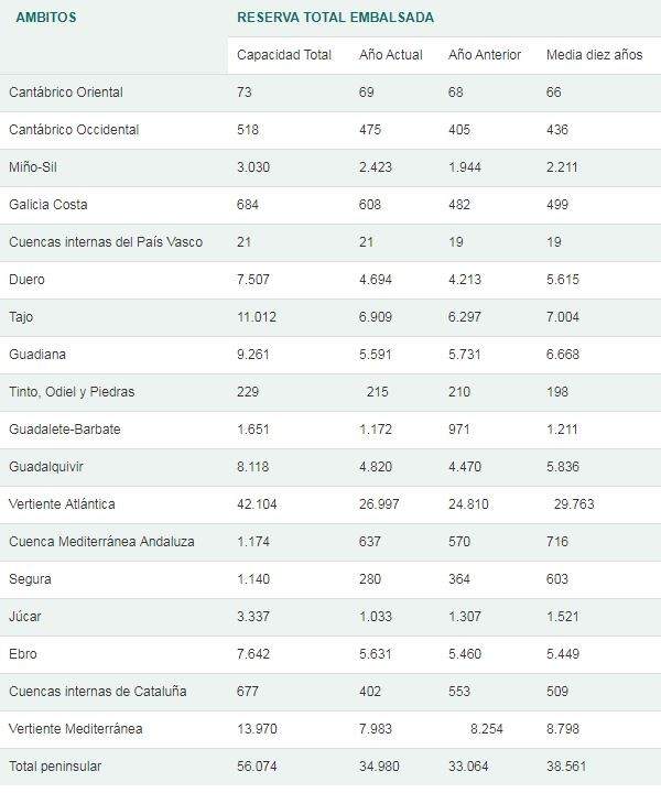 La situación de las cuencas, en hectómetros cúbicos, se detalla en el cuadro adjunto, que permite comparar la capacidad total de agua, con la embalsada a día de hoy y la que había el año pasado y hace justo una década.
