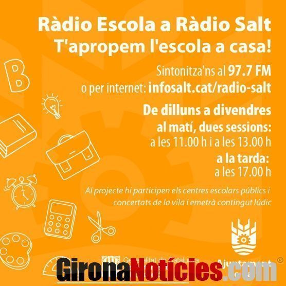 Aquest dijous 16 d'abril es posarà en marxa el programa Ràdio Escola a Ràdio Salt, una iniciativa que neix amb l'objectiu d'obrir un nou canal de comunicació dels centres escolars amb l'alumnat i les seves famílies. Es tracta d'una iniciativa impulsada per Josep Tort Coma, assessor dels Serveis Educatius del departament d'Educació de la Generalitat, amb la col·laboració del director de Ràdio Salt, Jofre Ferrer.