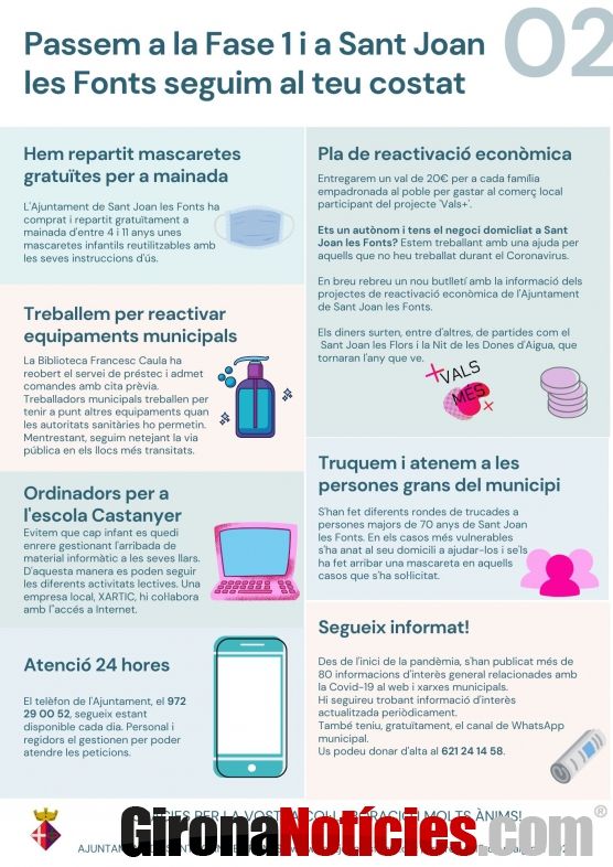 És la segona edició d'aquest butlletí que arriba un cop s'ha passat a la fase 1 i serveix per recordar mesures existents i d'altres que s'han posat en marxa darrerament. Entre elles hi ha el pla de reactivació econòmica (que ocuparà íntegrament un proper butlletí), el repartiment de mascaretes, les trucades a majors de 70 anys o la desinfecció d'espais públics pensant en la reobertura quan sigui possible.